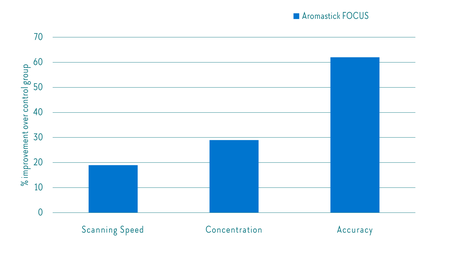 Résultats : le groupe Aromastick® Focus a montré une amélioration de +29 % de la concentration (nombre de cibles correctement identifiées) par rapport au groupe témoin et une augmentation de +19 % de la vitesse de traitement des données tout en faisant moins d’erreurs (5 % contre 13 % dans le groupe témoin).